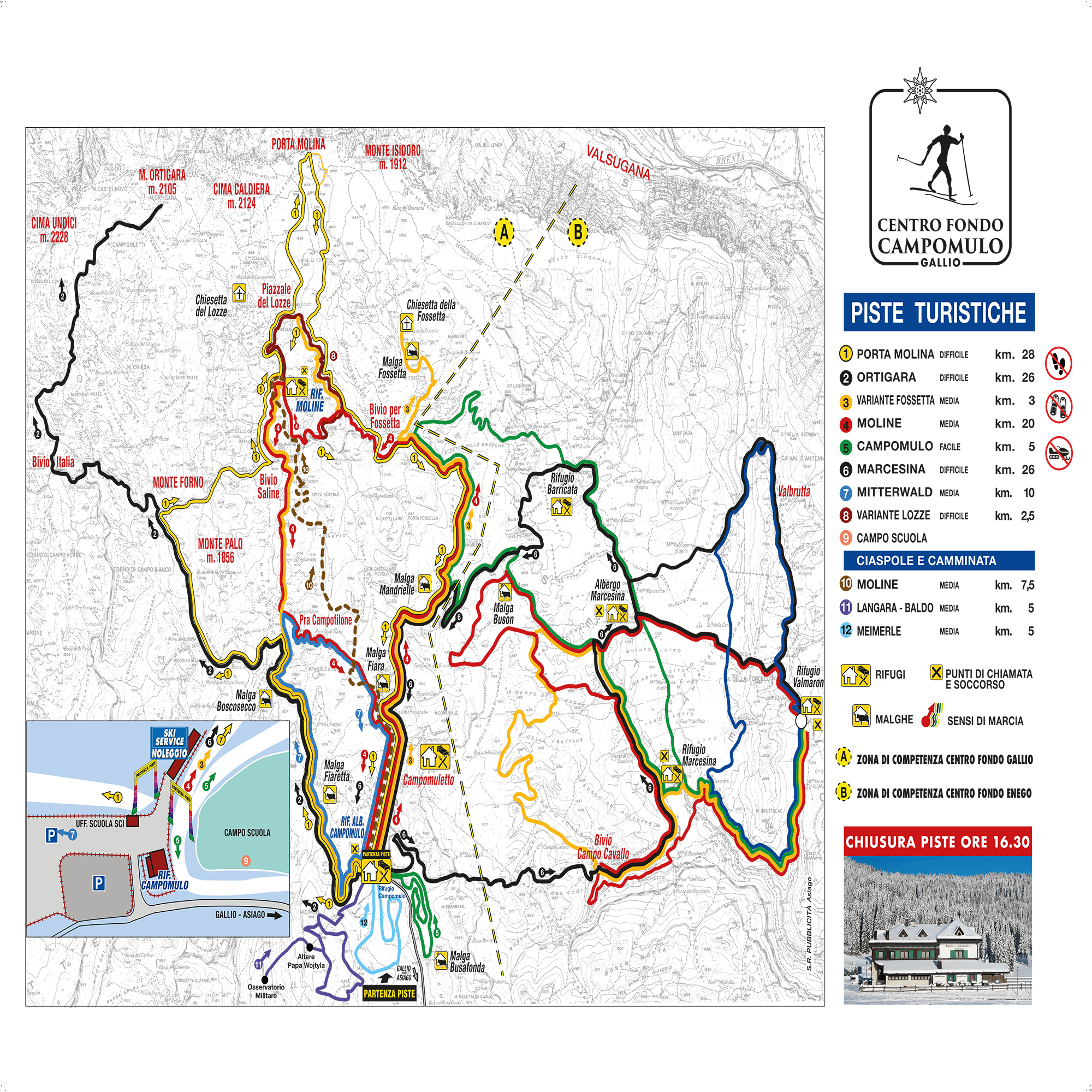 La più facile e la più breve è la pista verde “Campomulo”, di 5 km, adatta soprattutto ai principianti. Il tracciato rosso "Moline" è adatto a tutti, mentre i più esperti possono scegliere tra la gialla "Valsugana", la gialla "Fossetta", la nera "Marcesina", la variante "Pozze", la bretella "Porta Molina". Per gli sciatori provetti, c’è infine la pista nera “Ortigara”, la più difficile tra tutte.